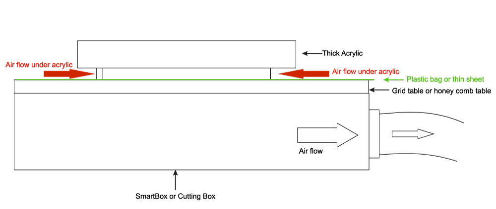 很多人喜歡從筆車上使用強大的吹氣,對著壓克力的頂部吹強風。大多數人認為這樣可以將壓克力冷卻下來,並使表面的火焰熄滅。然而,這只適用於雷射雕刻或切割薄的材料。在切割厚的壓克力時,如果火焰在壓克力上熄滅,可能是雷射器的功率不夠,不能完全切割壓克力,或者速度太快。