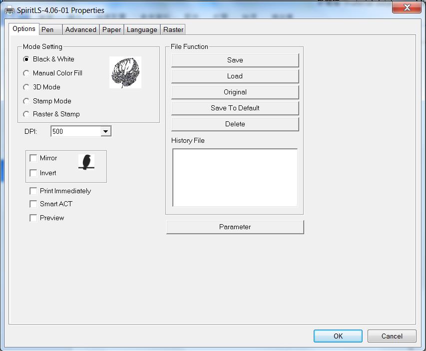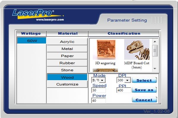 | By clicking "Print" once your design is ready in your graphic design software and choosing "Options" before clicking "Parameter", the material database will pop up with suggested parameter settings for specified materials and job type. | |