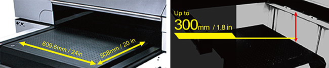 With the maximum of 609.6x508mm (24”x20”) printing area and 300mm (11.8”) media thickness allowance, JF-240UV is able to satisfy different printing needs and outplay the opposition in the market. |